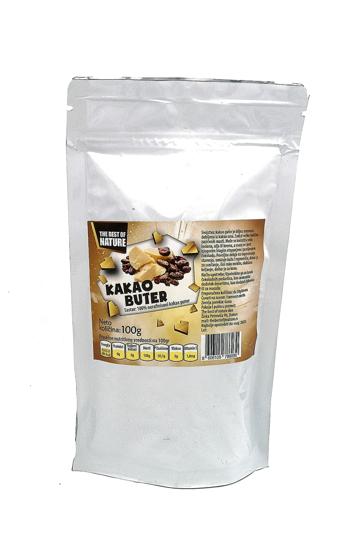 Kakao buter ima veoma visok sadržaj antioksidanata koji se bore protiv slobodnih radikala i sprečavaju pojavu prvih znakova starenja kože i štetnih uticaja iz životne sredine na nju.Ovu supstancu ne samo da možete da nanosite u obliku krema, losiona i ulja, već je čak možete i jesti u sirovom obliku.Budući da sadrži dopamin, triptofan, cink, omega-6 i omega-9 masne kiseline, odnosno, hranljive materije koje su potrebne koži, kakao buter oživljava umornu i beživotnu kožu.Nezamenjiv u nezi kože i kose u letnjim mesecima. Kakao buter obiluje vitaminom E i odličan je zaštitnik kože. Ovaj sastojak naširoko korišćen u najkvalitetnijoj kozmetici, poznat je kao izuzetno efikasan omekšivač i ovlaživač kože.Deluje podmlađujuće, izglađuje bore i vraća sjaj i elastičnost koži. Kakao buter stvara tanak zaštitni film koji štiti kozu od UVA i UVB štetnih zraka i drugih negativnih spoljnih uticaja.Kakao Buter odgovara svim tipovima kože, a posebno osobama sa osetljivom, suvom i zahtevnom kožom. Izuzetno brzo se upija i ne ostavlja mastan trag.Za negu kože pre sunčanja (kao priprema), za vreme sunčanja (štiti kožu i ubrzava tamnjenje) i nakon sunčanja (za elastičnost, umirenje, osveženje i opuštanje kože), jedan je od najboljih prirodnih sastojaka.<br />