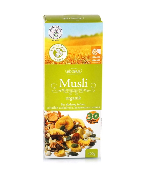 100% organski sertifikovani sastojci ,bez aditiva i garantuju zdrav i prirodan obrok. Ovsene pahuljice organske, suvo grožđe organsko, kokos listići organski (15%), čokoladni komadići organski (10%), (šećer od trske, kakao masa, kakao puter, emulgator: sojin lecitin, aroma vanile), integralni korn fleks organski (kukuruzno brašno, glukozni sirup, šećer, cimet, so), ekspandirani pirinač organski, suncokret sirovi oljušteni organski. Svi sastojci nose organski sertifikat.